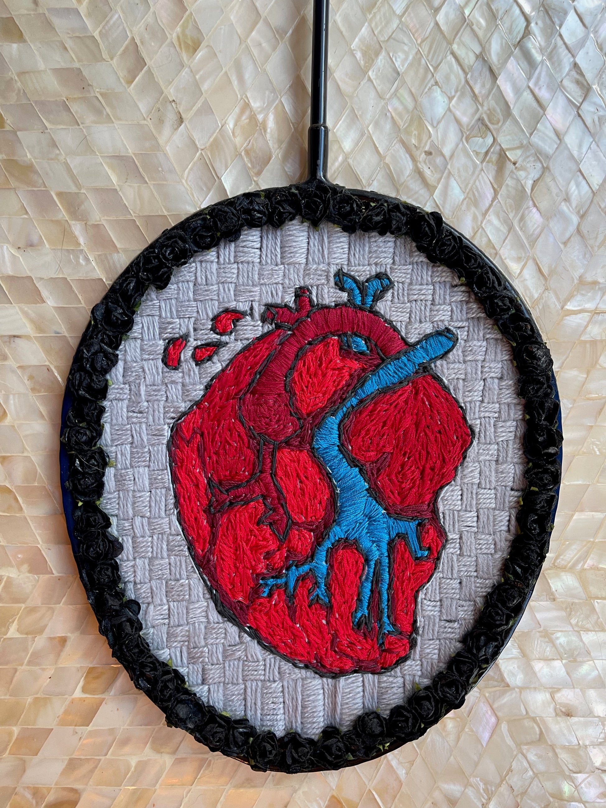 Needlepoint on badminton racket